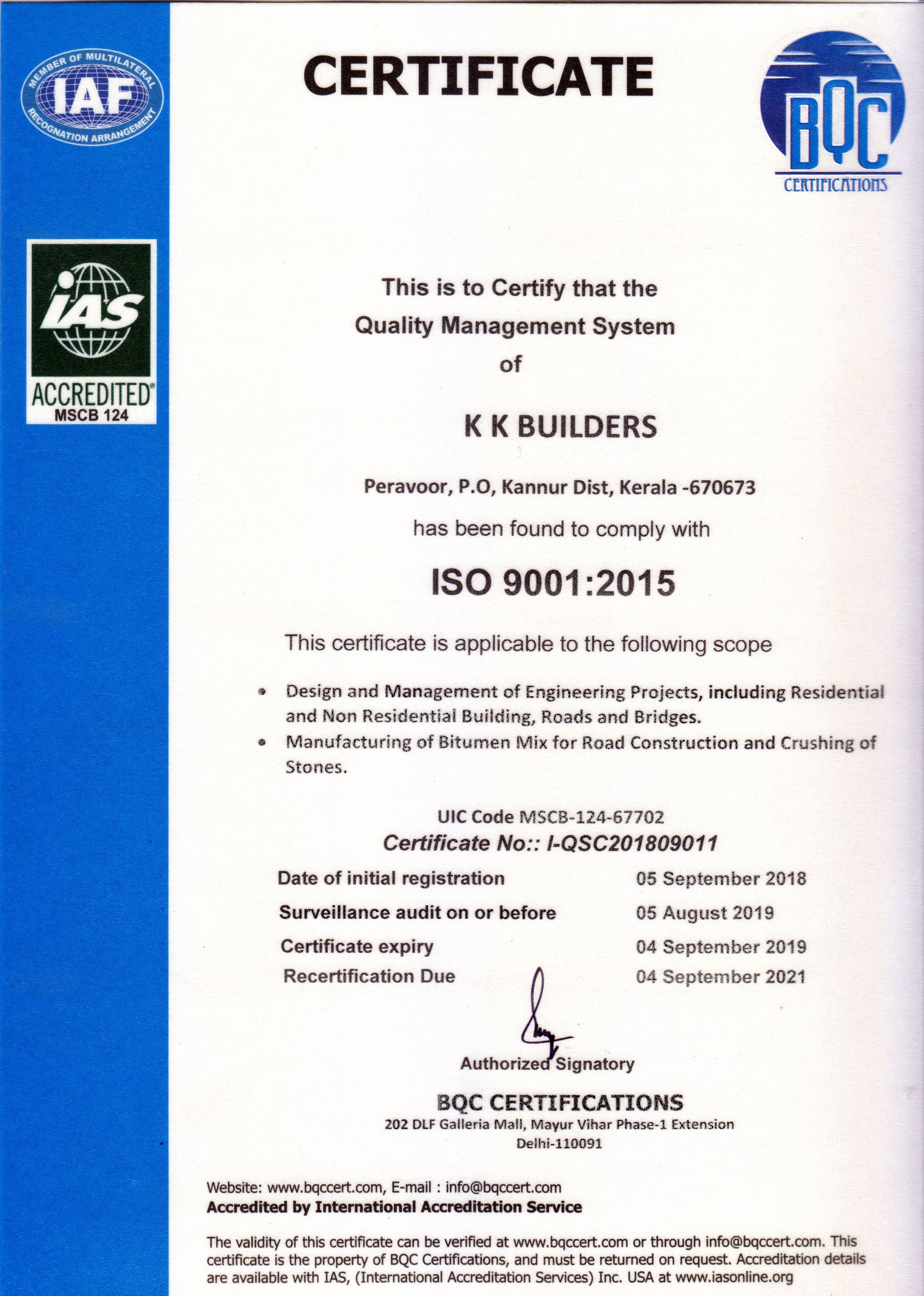 KK Builders is one of the leading civil engineering contractors with quality and environmental certifications in South India. The firm has the infrastructural setup as well as manpower to execute civil engineering projects of any nature and magnitude in a time-bound manner